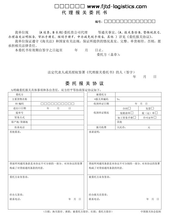 在接到委托方交付齊備的隨附單證后,負責依據委托方提供的單證,按照《中華人民共和國海關進出口報關單填制規范》認真填制報關單,承擔“單單相符”的責任,在海關規定和本委托報關協議中約定的時間內報關,辦理海關手續。