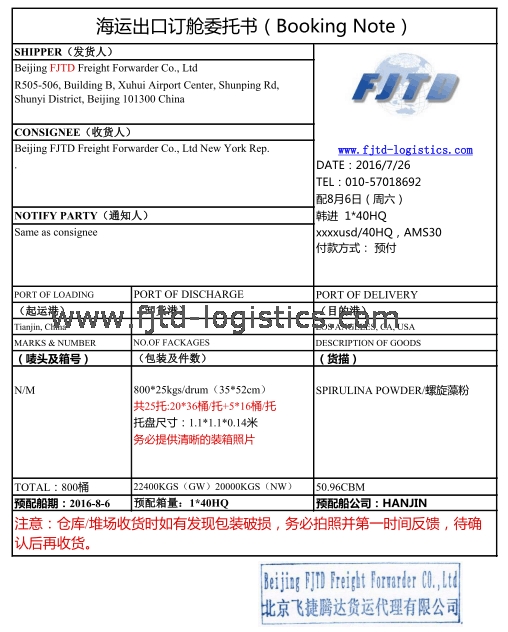海運出口訂艙委托書(Booking Note) SHIPPER(發貨人) m.jnzxjgm.com Beijing FJTD Freight Forwarder Co., Ltd DATE:2016/7/26 R505-506, Building B, Xuhui Airport Center, Shunping Rd, Shunyi District, Beijing 101300 China TEL:010-57018692 配8月6日(周六) CONSIGNEE(收貨人) 韓進1*40HQ Beijing FJTD Freight Forwarder Co., Ltd New York Rep. xxxxusd/40HQ,AMS30 NOTIFY PARTY(通知人) 付款方式: 預付 Same as consignee PORT OF LOADING PORT OF DISCHARGE PORT OF DELIVERY (起運港) (卸貨港) (目的港) Tianjin, China LOS ANGELES, CA, USA MARKS & NUMBER NO.OF FACKAGES DESCRIPTION OF GOODS (嘜頭及箱號) (包裝及件數) (貨描) N/M 800*25kgs/drum(35*52cm) SPIRULINA POWDER/螺旋藻粉 共25托:20*36桶/托+5*16桶/托 托盤尺寸:1.1*1.1*0.14米 務必提供清晰的裝箱照片 TOTAL:800桶 22400KGS(GW)20000KGS(NW) 50.96CBM 預配船期:2016-8-6 預配箱量:1*40HQ 預配船公司:HANJIN