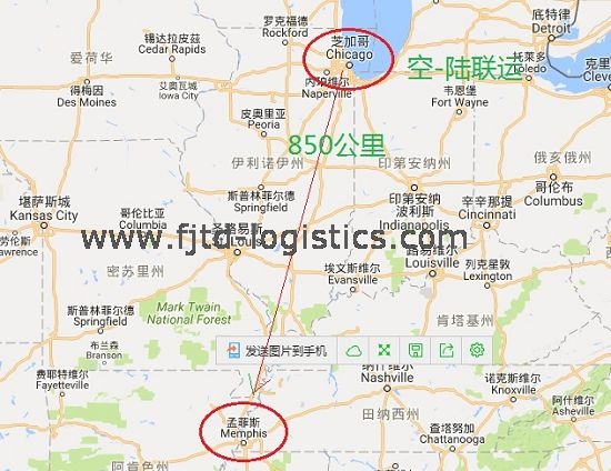 辦法總是有的。我是怎么做的呢?第一反應想到了是否可以空-陸聯運,因為查看地圖發現孟菲斯距離芝加哥不算太遠(約850公里),因為我們知道,芝加哥位于美國中部,無論空運、鐵路還是公路運輸都非常發達,到美國內陸的很多貨物都是通過芝加哥中轉,芝加哥可以算是美國最大、最有名、最發達的交通樞紐和轉運中心。