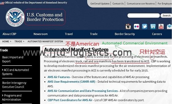 The Automated Manifest System (AMS) is used only for the processing of electronic air manifests. Processing of electronic truck, rail and sea manifests has been transitioned to ACE. CBP is working to develop modernized electronic manifest processing for the air environment. Implementation of air electronic manifest processing in ACE is currently scheduled for early 2015. 懂英文的朋友,自己去體會。更多詳情請看:https://www.cbp.gov/trade/automated