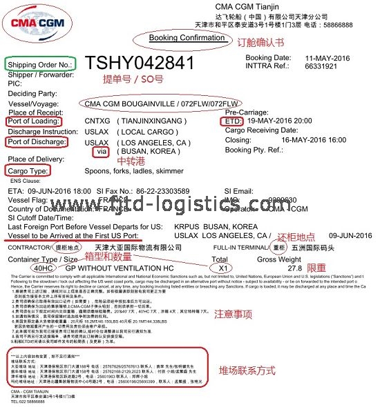 船公司的Logo和名稱以及Shipping order 或Booking Confirmation的字樣,S/O號(Shipping order No.通常也是提單號),船名/航次(vessel/voyage),起運港POL,卸貨港POD,中轉港(via如有),預計開船日期ETD,截港日期(closing date),截補料時間(SI cut off),箱型和箱量(container type/size),提空柜地點(contractor),還重柜地點(full-in terminal),最大重量(Gross Weight Limit),堆場聯系方式以及注意事項等。