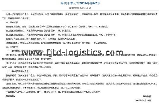 10月30日消息,昨日,海關總署發布《海關總署公告2016年第62號》,將開展稅收征管方式改革試點工作。該公告將于2016年11月1日起正式施行,《中華人民共和國進出口稅則》(以下簡稱《稅則》)第84、85、90章商品的試點自2016年12月1日起施行。