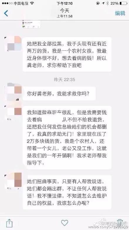 今日,有一位做微商的寶媽向知名電商自媒體人龔文祥求救,她說(shuō)自己做微商屯了兩萬(wàn)元的貨,而自己又來(lái)自農(nóng)村,兩萬(wàn)元的貨款相當(dāng)于自己一年的開(kāi)銷了。自己最近生病了,可是她之前加入的團(tuán)隊(duì),卻不愿意給她退款。真可謂是欲哭無(wú)淚啊,詳細(xì)內(nèi)容看下面的圖片: