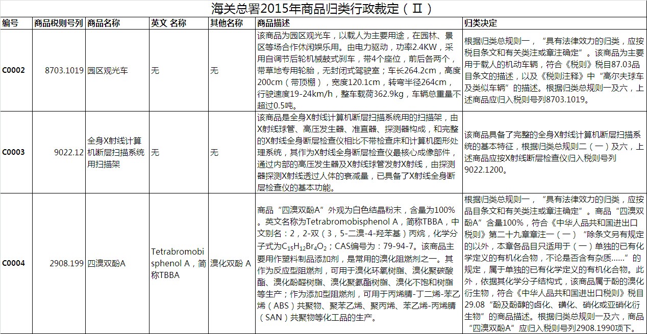 海關(guān)總署2015年商品歸類行政裁定(Ⅱ)