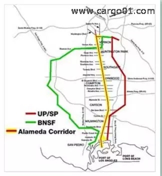 洛杉磯港原有的海鐵聯運設施是由兩家知名的美國鐵路公司運營的。一是北伯靈頓圣塔菲鐵路公司(BNSF),通常美國同行把這家公司稱為西部鐵路公司,這家公司的貨運版圖主要集中在美國的中部和西部;另一個是聯合太平洋鐵路運輸公司(UP)。這兩家鐵路公司在該區原有四條單向鐵路引入港口,他們采用的重載列車最長可達2.5公里,四條鐵路與城市道路形成200個平面交匯道口,每天約有35列火車,以32公里/小時的時速通過這些道口。這種局面如不改善,港口與城市的矛盾將不堪設想。