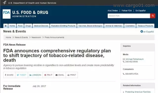 7月28日,美國FDA在官網上發布公告,宣布了一項新的煙草和尼古丁監管綜合計劃,說:“計劃不久發布一份新的執行政策的指南”,推遲電子煙產品的注冊申請時間。