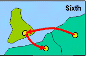 本國飛機可以用兩條航線的名義,接載A國和B國乘客及貨郵往返,但途中必須經過本國——以本國為“橋梁”載運A國乘客及貨郵到B國,和/或以本國為“橋梁”載運B國乘客及貨郵到A國。這就是第六航權:橋梁權。