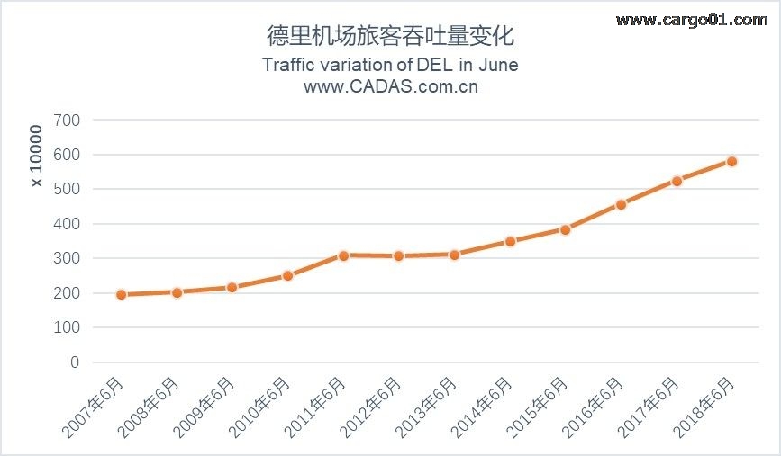 2017年旅客吞吐量全球排名前15的機場,2018上半年旅客吞吐總量均超過3000萬人次,平均增速為4.84%。按照2018上半年旅客吞吐量初步排名,2018年排名前15的機場旅客吞吐量平均增速為5.08%,其中德里機場增速達13.4%,增速最快。以德里機場近年6月的旅客吞吐量為例,自2014年起,德里機場6月份的旅客吞吐量處于逐年遞增狀態(tài),平均增速達13.3%。2018上半年排名前15機場中,首爾機場增速12.16%排第二,浦東機場、廣州機場、北京首都機場增速位列前五。