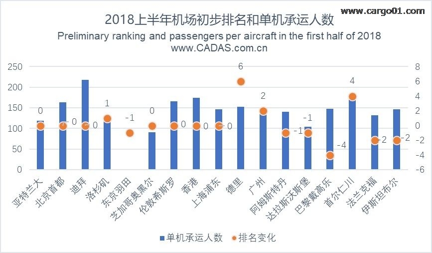 從起降架次方面觀察,德里機場飛機起降架次同樣增速最快,同比增長10.66%。旅客吞吐量最高的亞特蘭大機場的起降架次最多,其次為芝加哥奧黑爾機場。德里機場旅客吞吐量初步排名上升6位最多,由2017年第16位躋身第10位。同樣增速較快的首爾機場排名也由第19位上升第15位。而伊斯坦布爾機場旅客吞吐量同比增速達12.75%較高,但其旅客吞吐量排名由第15位下滑至第17位。法蘭克福機場旅客吞吐量排名由第14位下滑至第16位,巴黎戴高樂機場由第10位下滑至第14位,北京首都機場、香港機場、上海浦東機場仍保持2017年排名,分別位居第2、8、9位,廣州機場則由第13位上升第11位。通過觀察單機承運人數(shù)方面,迪拜機場的單機承運人數(shù)最高,其次為首爾機場、香港機場,可以看出這些機場對時刻的利用更充分(時刻發(fā)揮更大“效益”)。