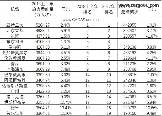 上半年全球前15機場排名出爐