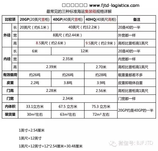 集裝箱的長(zhǎng)、寬、高計(jì)算如下: (1)寬度:8英尺=8*30.48=2.438米;(20GP、40GP和40HQ的寬度都一樣) (2)普柜高度:8.5英尺=8英尺+6英寸=8.5*30.48=2.59米;(這是20GP和40GP的高度) (3)高柜高度:9.5英尺=9英尺+6英寸=9.5*30.48=2.89米;(這是40HQ的高度) (4)小柜長(zhǎng)度:20英尺=20*30.48=6.096米;(這是20GP的長(zhǎng)度) (5)大柜長(zhǎng)度:40英尺=40*30.48=12.192米;(這是40GP和40HQ的長(zhǎng)度)